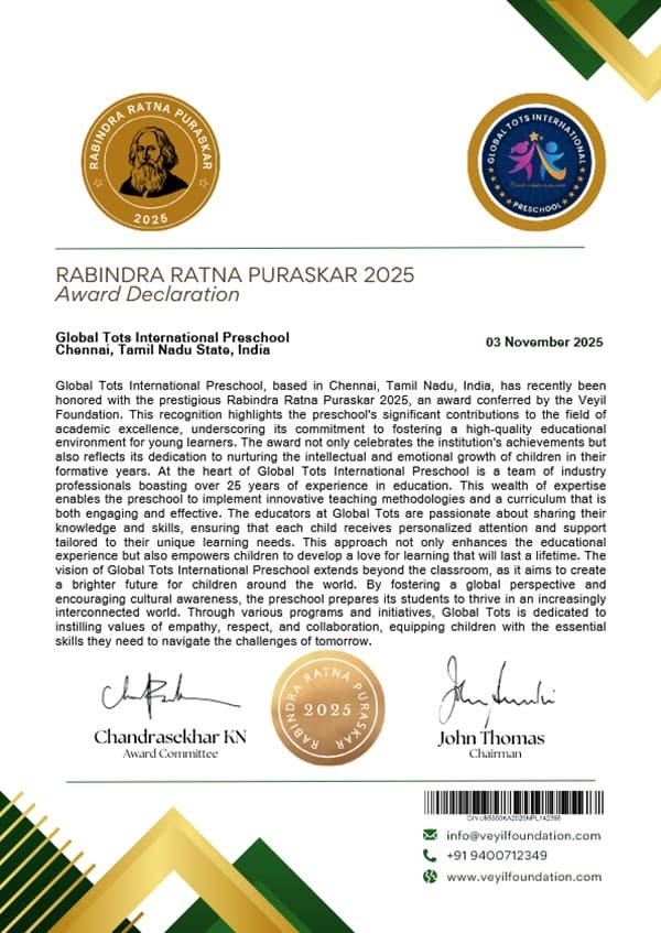 We are honored to be recognized as the Best Pre-School in Infrastructure (2025) for our safe, thoughtfully designed, and child-friendly learning spaces that encourage exploration, creativity, and holistic development. These recognitions reflect our commitment to creating an inspiring environment where young learners thrive.